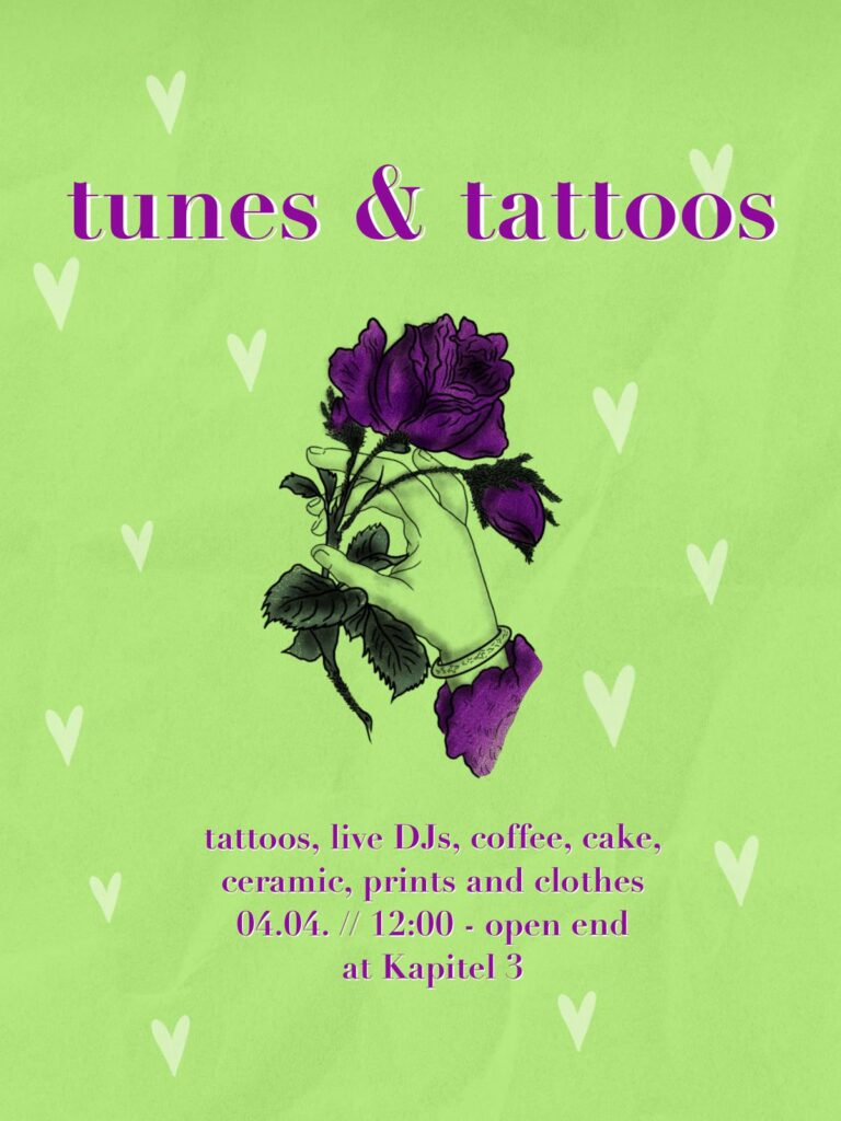 Tunes & Tattoos ist ein Community Event für alle Tattoofreundinnen. Dabei kommt es nicht darauf an wie viele Tattoos du schon hast oder dir stechen lassen wirst. Alle sind willkommen und eingeladen. Also komm gerne auch nur fürs Flash-Book stöbern, Kaffee trinken und quatschen vorbei. Desweiterem gibt es Handgemachte Kunst (Keramik & Klamotten) von kleinen, lokalen Künstler*innen. Unsere DJs verwöhnen uns währenddessen rund um die Uhr mit bunten Beats.